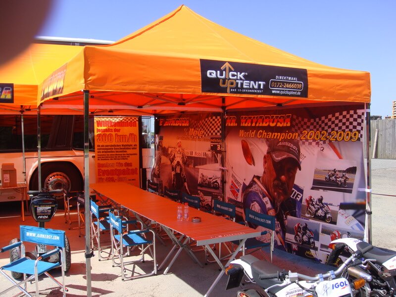 Irgendwann war der Rennprofi und studierte Ökonom die Jagd nach dem richtigen Zelt leid und tat, was ihn im Leben schon oft weiter­gebracht hatte: Er nahm die Sache selbst in die Hand, gründete eine Firma, entwickelte die Trademark "QUICKUPTENT" und wurde Hersteller für Faltzelte. Unnötig zu sagen, dass dabei all seine Er­fahrungen aus über zwanzig Jahren Profirennsport in die Produkt­entwicklung einflossen. Die Liste der QUICKUPTENT-Kunden liest sich wie ein "Who is Who" des Top-Motorsports und Veranstaltungsmanagements:
