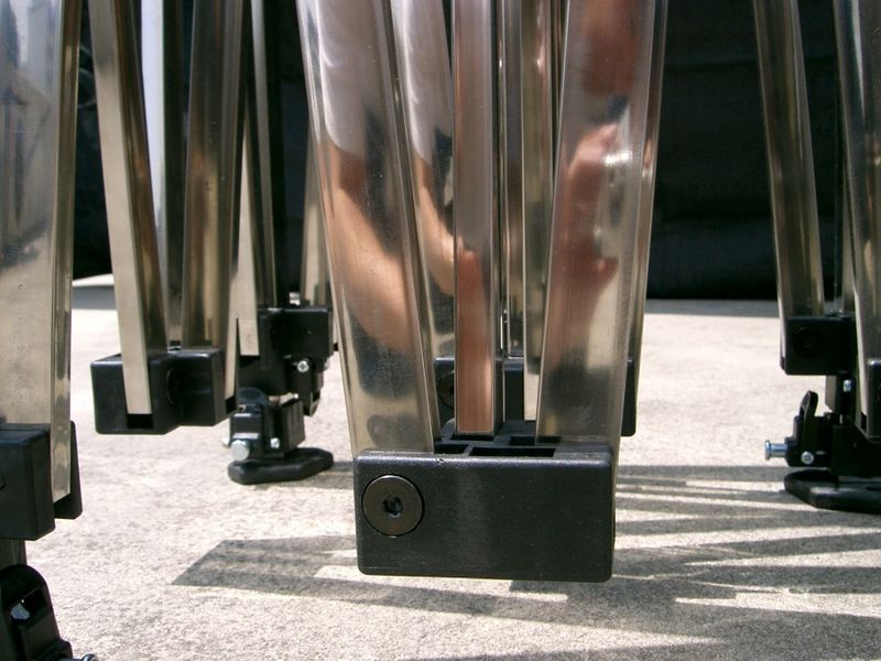 Zwar bietet sich auf den ersten Blick als Material für die Falt­gestänge Aluminium an – es ist leicht, korrosions­beständig und sieht gut aus. Jedoch ist Alu­minium ein weiches Material, das somit auch schon mal beim Aus­ein­ander­ziehen hakt; auch seine schlechte Schweißbarkeit und vor allem die problem­atische Dauer­bruch­festig­keit wirft es weit zurück gegenüber einem besseren und edleren Materialkandidaten: V2A-Edelstahl. Dieser Legierungstyp nichtrostenden Stahls (Fachbezeichnung X5CrNi18-10 / Werkstoffnummer 1.4301), ist wegen seiner Korrosions­be­ständig­keit praktisch uneingeschränkt strapazierfähig.
