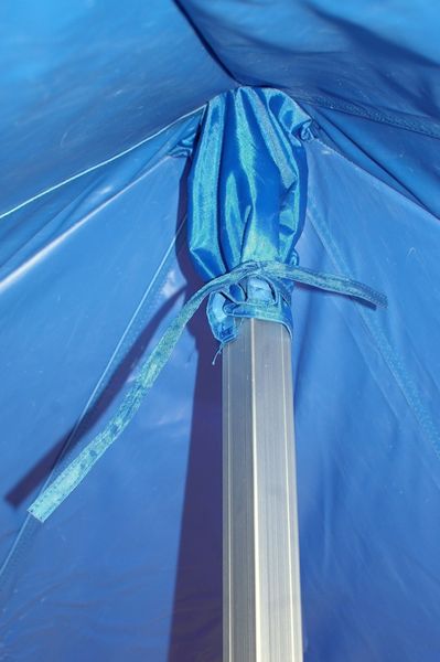 Die Schutzschuhe (innen in der Spitze des Faltzelt-Daches) über die Domstreben stülpen, die Bändchen einmal herumwickeln und zusammen binden.