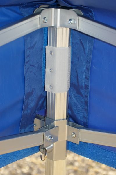 Mit den jeweils an den Ecken des Faltzelt-Daches befestigten Abspannösen und den mitgelieferten Bodenhaken können Sie das Falt Zelt auf dazu geeigneten Untergründen zusätzlich sichern.