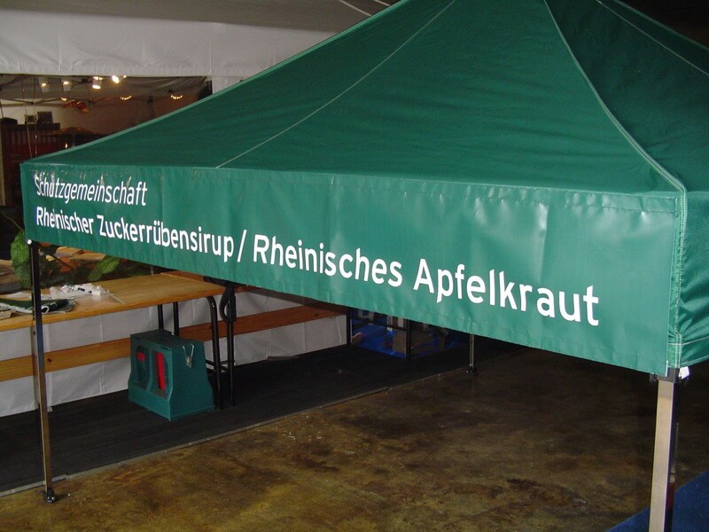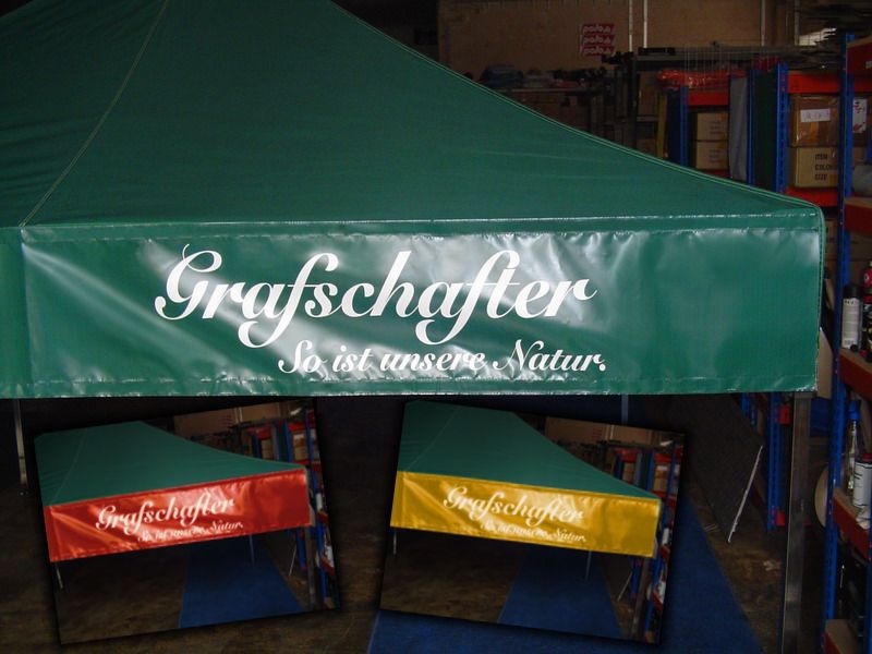 Am kostengünstigsten & wirkungsvollsten ist der Volant des Faltzeltes (=gerader Teil des Daches/Überhang) zu branden, weil er dem Betrachter direkt „ins Auge“ springt.
