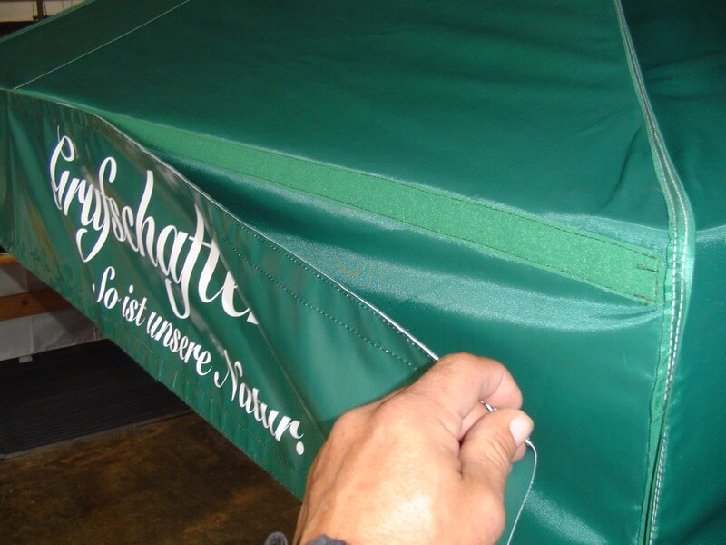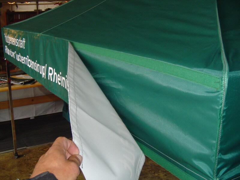 Alternativ kann Ihr Faltpavillon mit austauschbaren Volants konfektioniert werden. Dabei wird Ihr Werbedruck auf unser hauseigenes Druckmedium in 4c-Druck gedruckt und mittels Klett und Flausch auf dem bestehenden Volant, dem geraden Teil des Daches, befestigt und kann ohne Mühe abgenommen oder ausgetauscht werden.