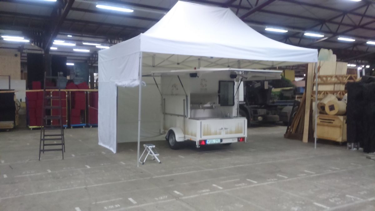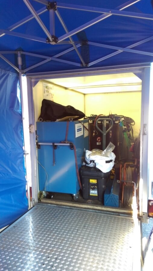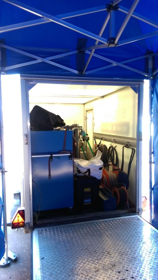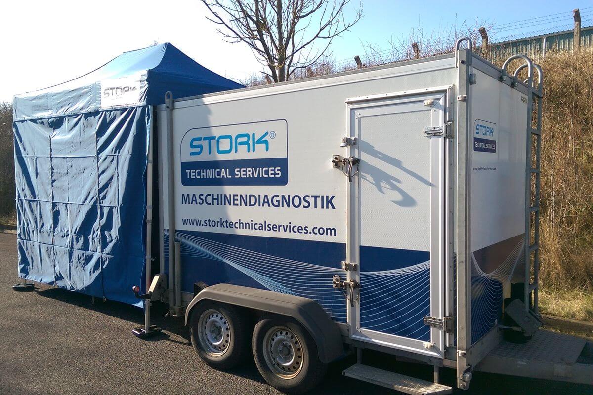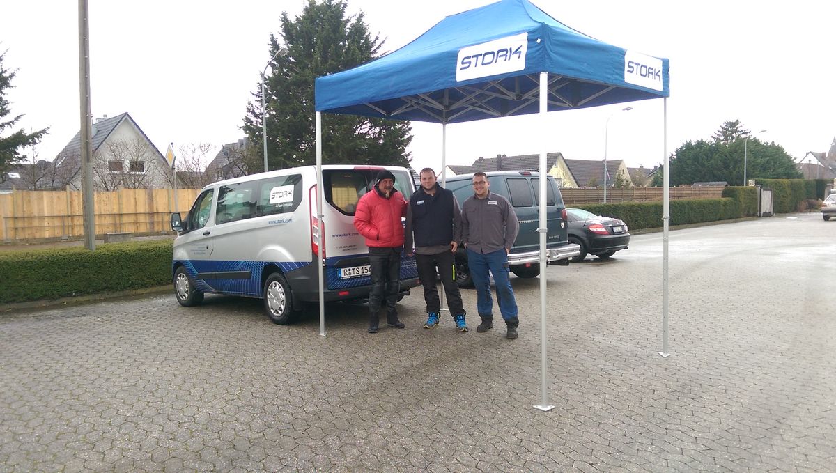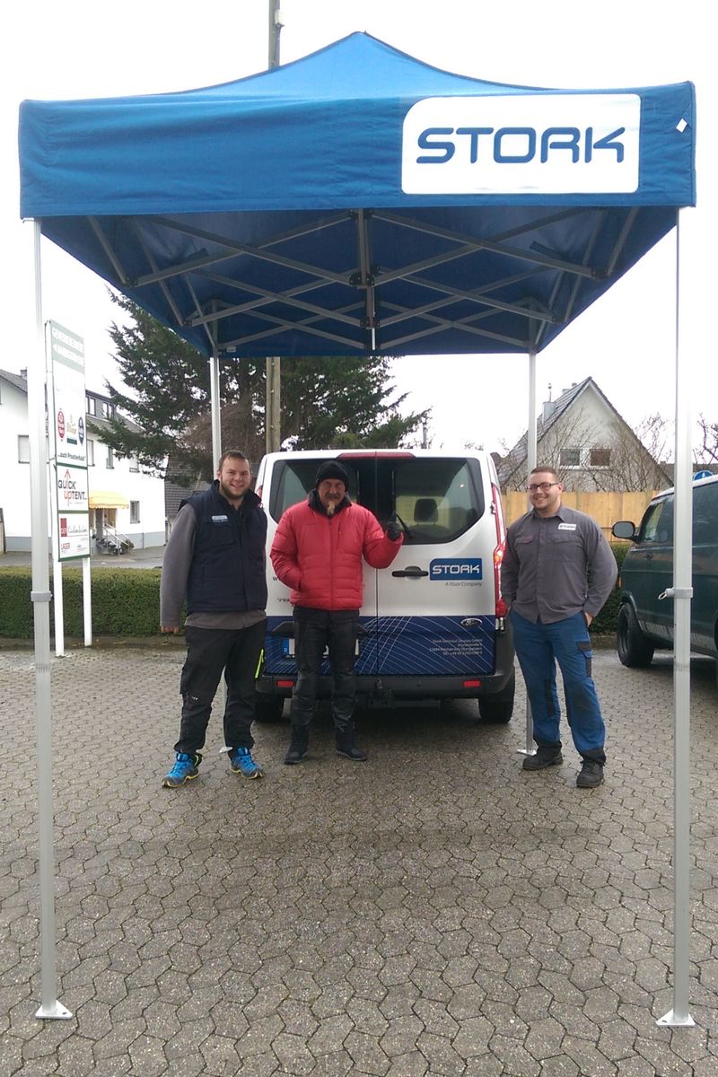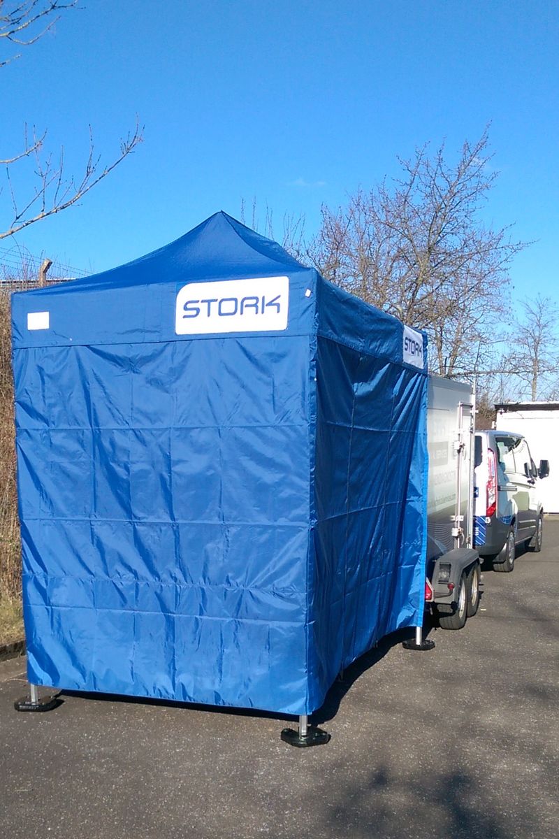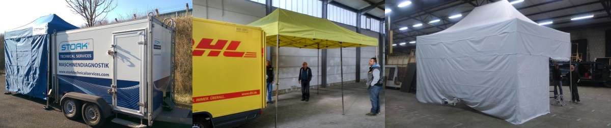 STORK Technical Services GmbH www.stork.com hält die (Produktions)-Anlagen ihrer Kunden "am Laufen". Mit multidisziplinären Wartungstätigkeiten, Turnarounds und Projekten verbessern sie permanent die Leistung von Kundenanlagen. Dazu müssen STORK-Mitarbeiter oft mit Transporter & Werkstattanhänger beim Kunden vor Ort sein. Für solche Außenreparaturarbeiten suchte STORK nun eine Lösung, Ihre Mitarbeiter nicht im Regen stehen zu lassen: deshalb sollte der Werkstattanhänger nach hinten mit einem 2x3m Montagezelt vergrößert werden. Erschwerend kam in diesem Fall hinzu, dass die Heckklappe des Werkstattanhänger auch als Arbeitsplateau in der waagerechten genutzt werden soll. Zudem soll das Zelt direkt an den Anhänger nahtlos anschließen - so wurden die vier Eckpfosten in diesem Fall um jeweils 40cm verlängert, damit die STORK- Mitarbeiter dieselbe Durchgangshöhe wie der Werkstattanhänger vorfinden und so nicht mit dem Kopf am Zeltdach hängen bleiben können. Dank der massiven 2mm Wandstärke des ALU-HEXAGON-Rahmens mit Wabenprofil hat die Stabilität des Werkstatt- & Montagezelt nicht gelitten.