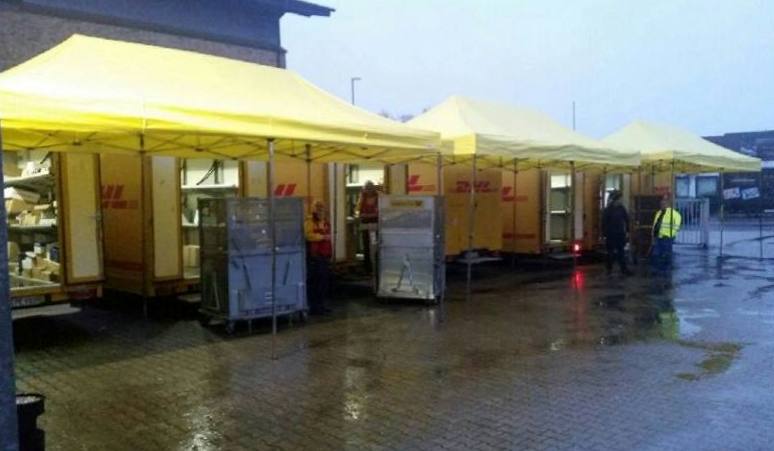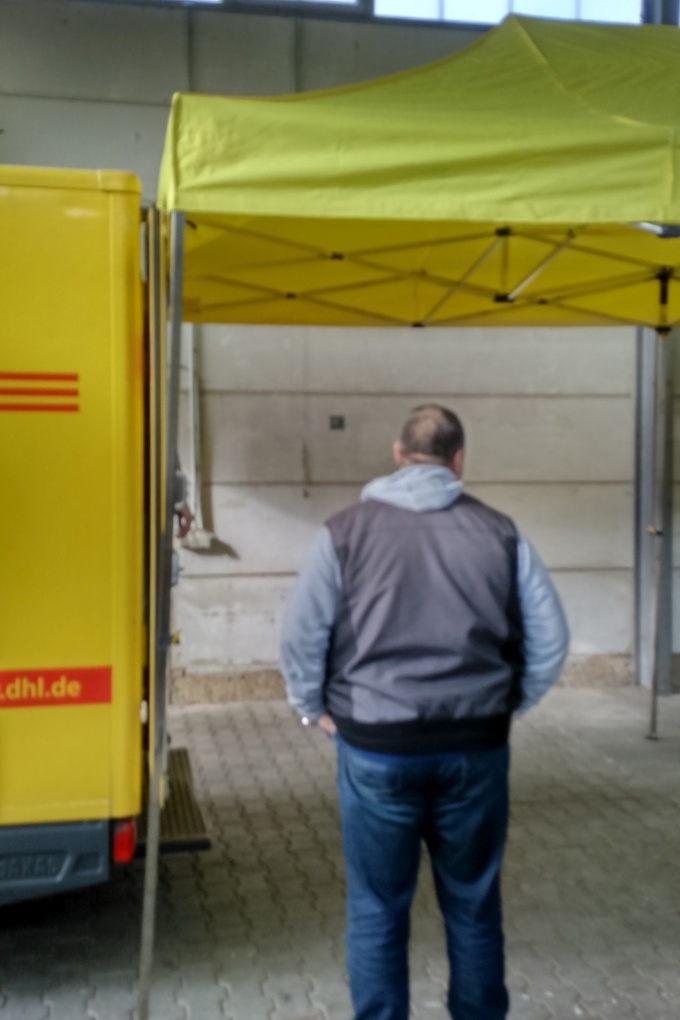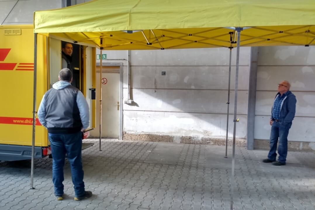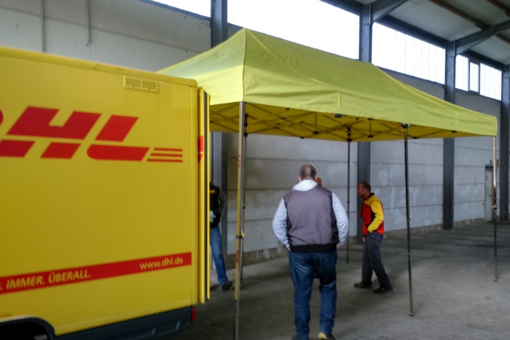 Als NRW-Pilotprojekt laden jetzt DHL Auslieferungsfahrer Ihre Zustellware im Trockenen in Ihre Transporter ein. Dafür wurden acht 6x3m Profi-Schnellaufbauzelte von QUICKUPTENT auf Wunsch der POST eCommerce auf eine Durchgangshöhe von 240cm erhöht!
