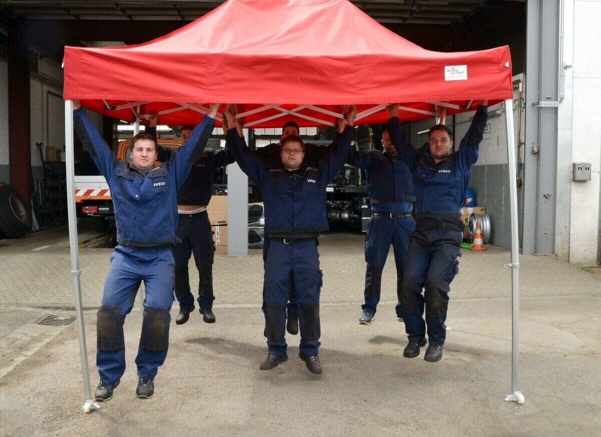 6 gestandene Mechaniker von TRUCKEXPERT machten den maximalen Beanspruchungstest und hängten sich mit Ihrem ganzen Körpergewicht in ein 3x2m Faltzelt unserer ALU-HEXAGON-Serie. Das entspricht ca. 550 kg Belastung auf unebenem Boden, also schwierigsten Bedingungen.