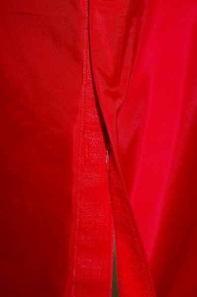 Die Tür wird mit zwei Reißverschlüssen geöffnet bzw. geschlossen und kann aufgerollt über dem Eingang ganz einfach mit Klett & Flausch fixiert werden.