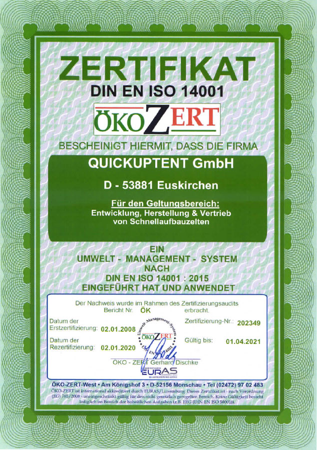 Die QUICKUPTENT GmbH ist der einzige Faltzelt-/Faltpavillon-Anbieter in Deutschland die nach DIN EN ISO 9001:2015 im Qualitätsmanagement und nach DIN EN ISO 14001:2015 im Umweltmanagement von IsoZert zertifiziert ist.